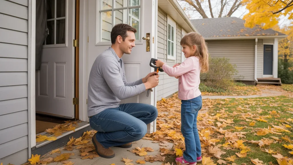 Father and daughter installing weather stripping around front door of Taylorsville home