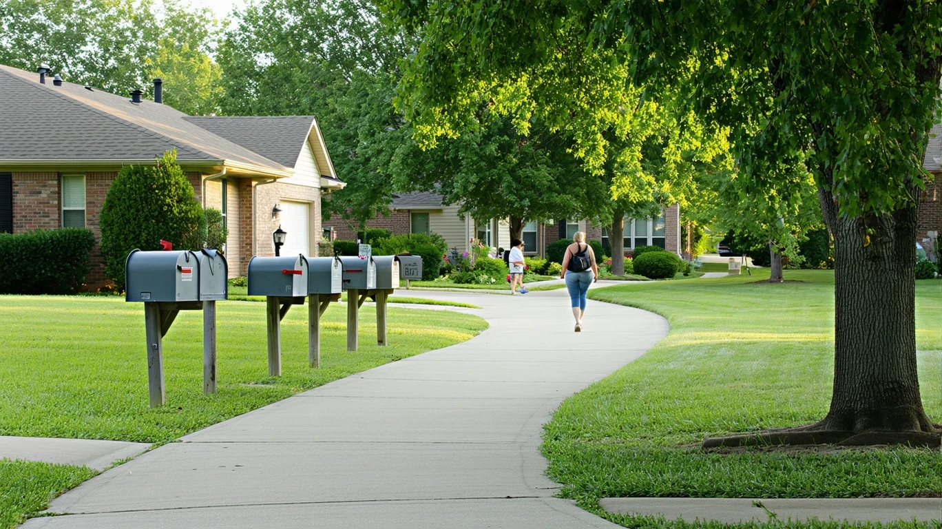 A sunny suburban sidewalk in The Village, Oklahoma lined with gray metal mailboxes and leafy trees.