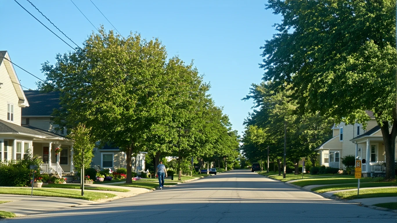 A sunlit residential street in The Village, Oklahoma with maple trees, telephone wires, and a pedestrian on the sidewalk.