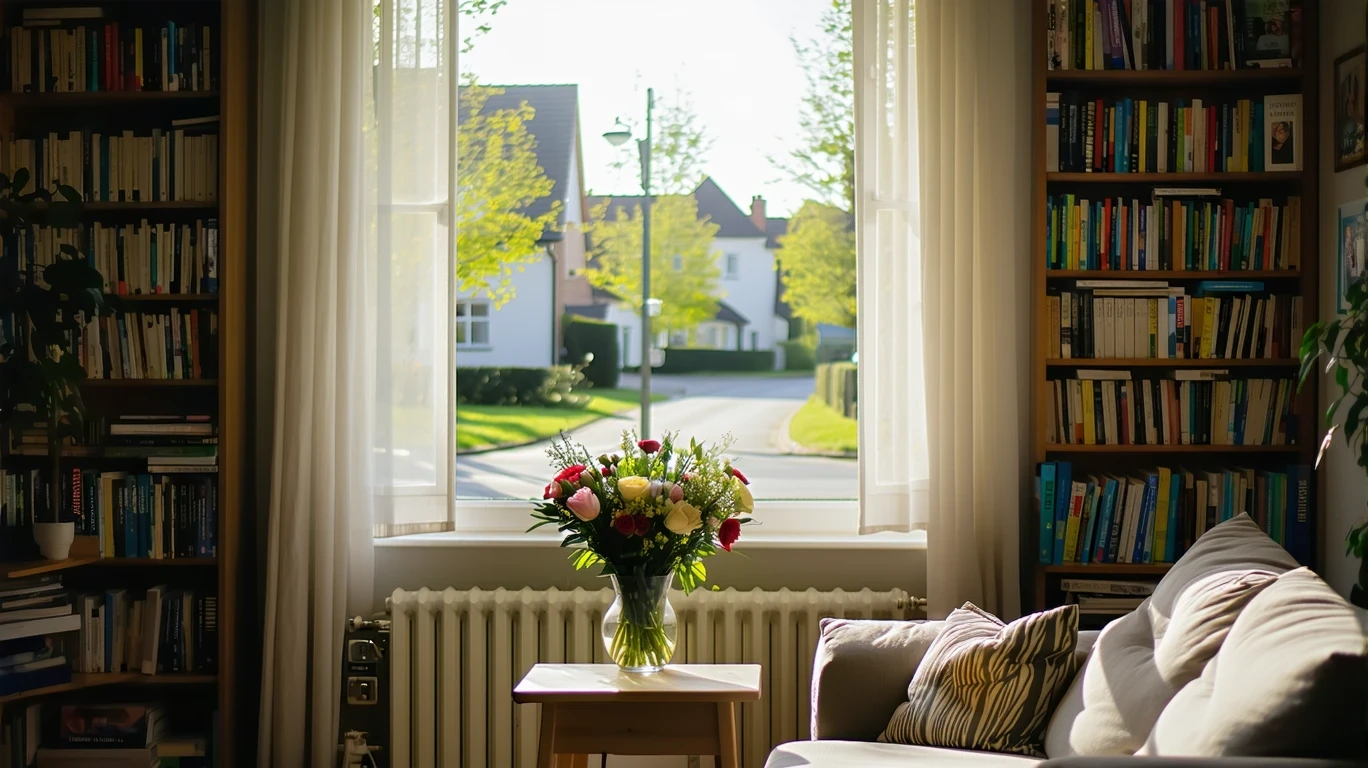 A sunlit living room with a couch, bookshelf, and view of a suburban street through sheer curtains.