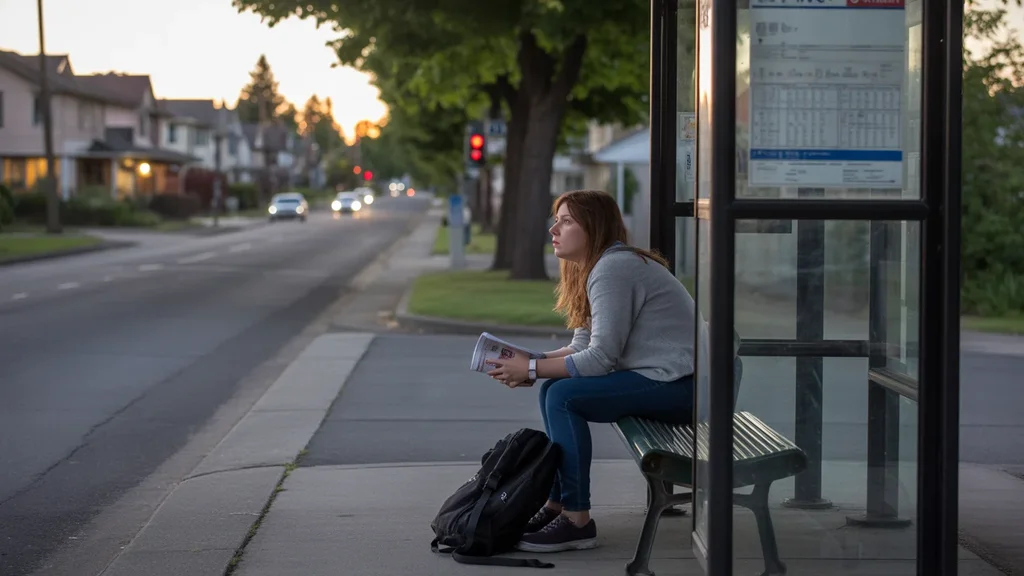 A college student waiting for the bus at dusk in a quiet Tigard neighborhood