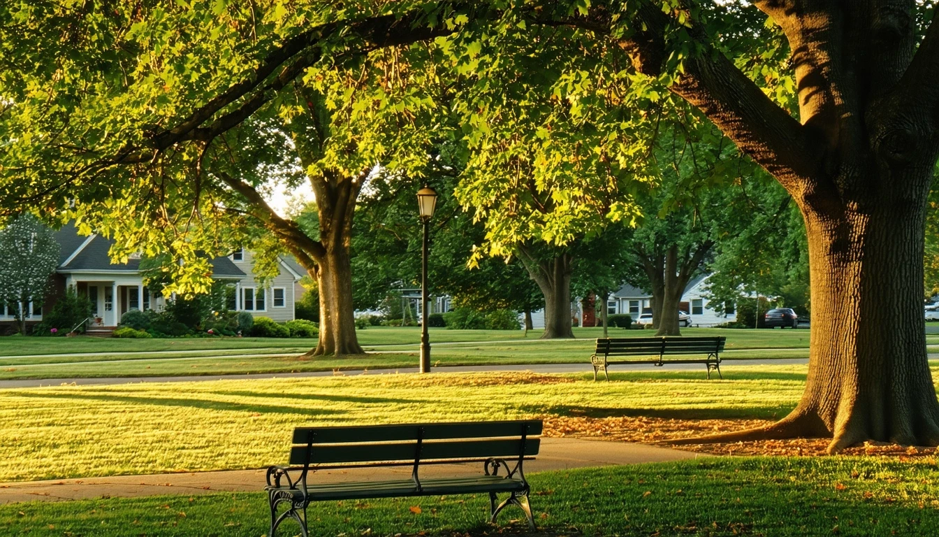 A peaceful park lawn with benches beneath oak trees during golden hour in Troy, Michigan.