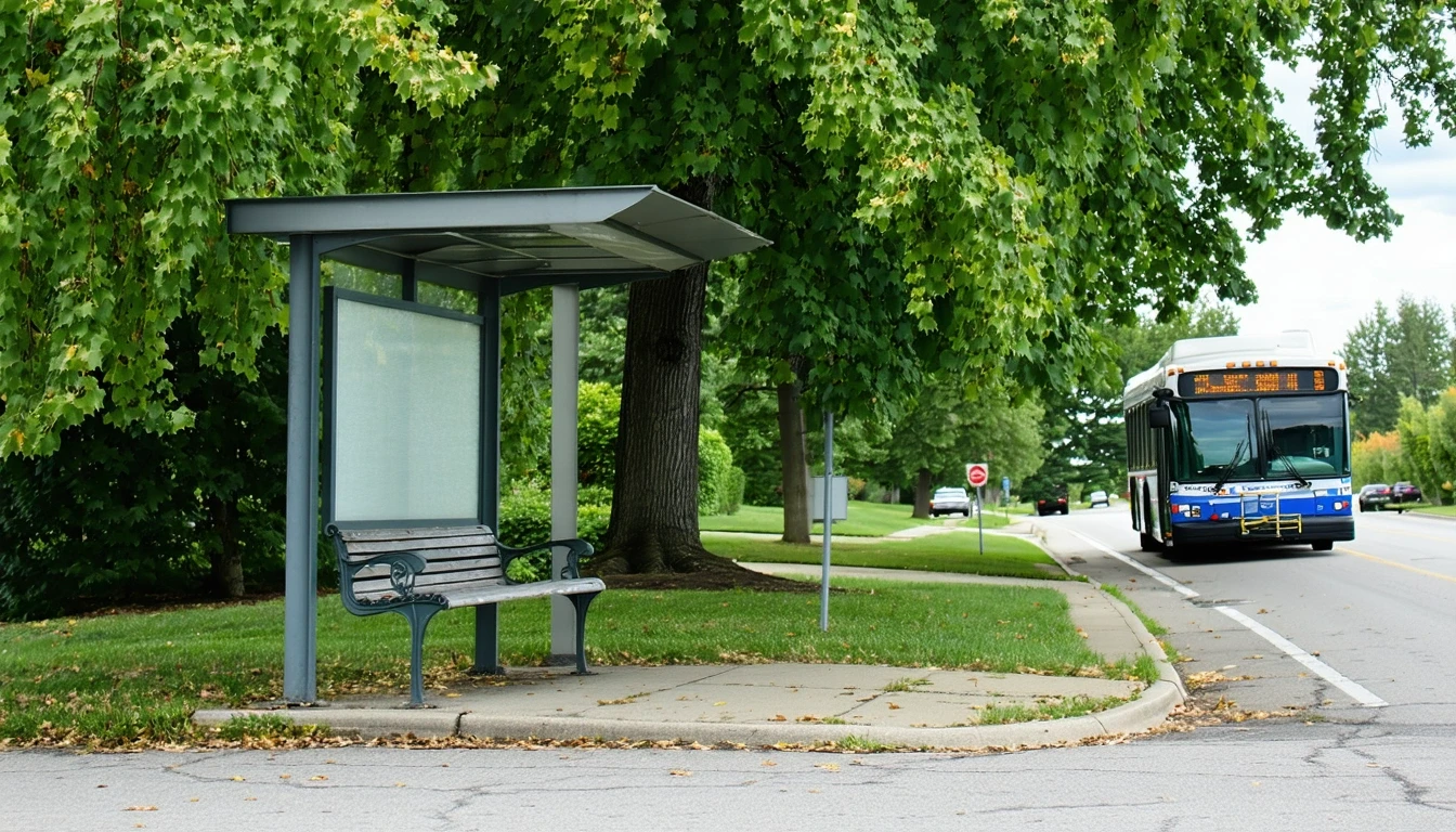 SMART bus shelter on a suburban street in Troy, Michigan with a bus idling nearby.