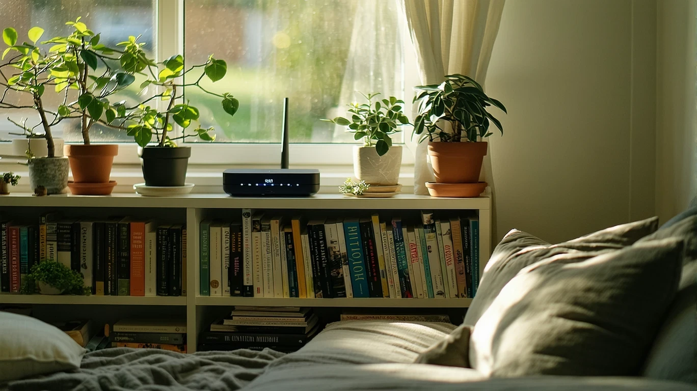 A bookshelf in an apartment with a Wi-Fi router and modem nestled among books and decor.