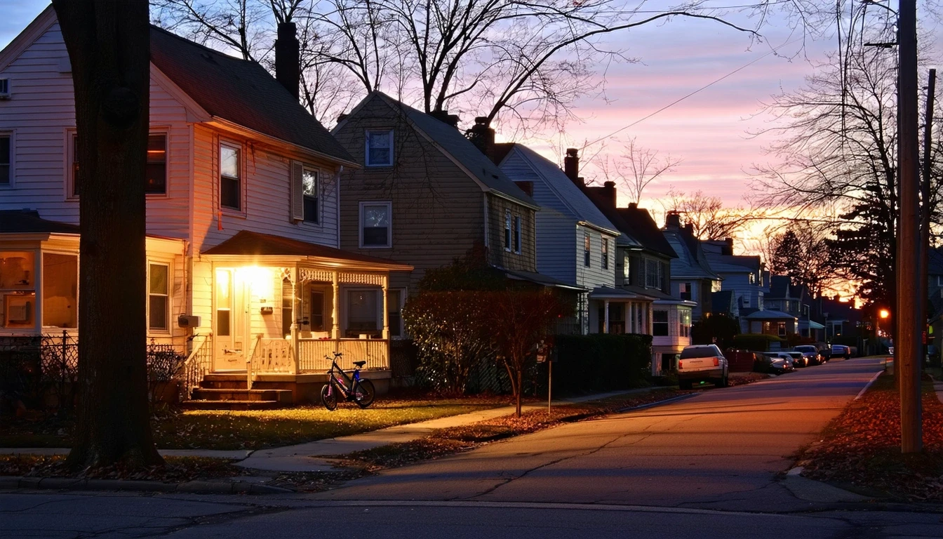 A quiet cul-de-sac in Upper Darby, PA at dusk with porch lights illuminating single-family homes and a child's bicycle near the curb.