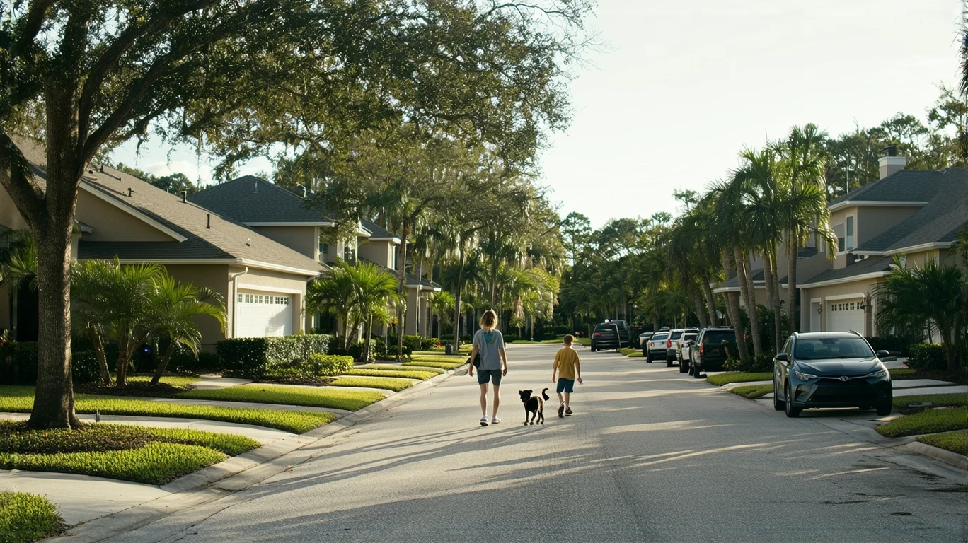 A sunny suburban street in Valrico, Florida lined with modest stucco homes and palm trees. A woman walks her dog past a skateboarding teenager on the sidewalk.