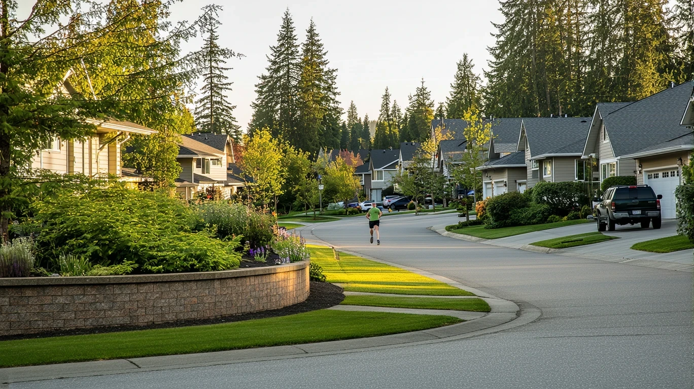 Suburban cul-de-sac in Vancouver, WA with homes, native plants, and one jogger in morning light.
