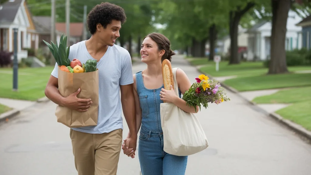 Couple in Versailles KY walking home from the grocery store on a sunny day