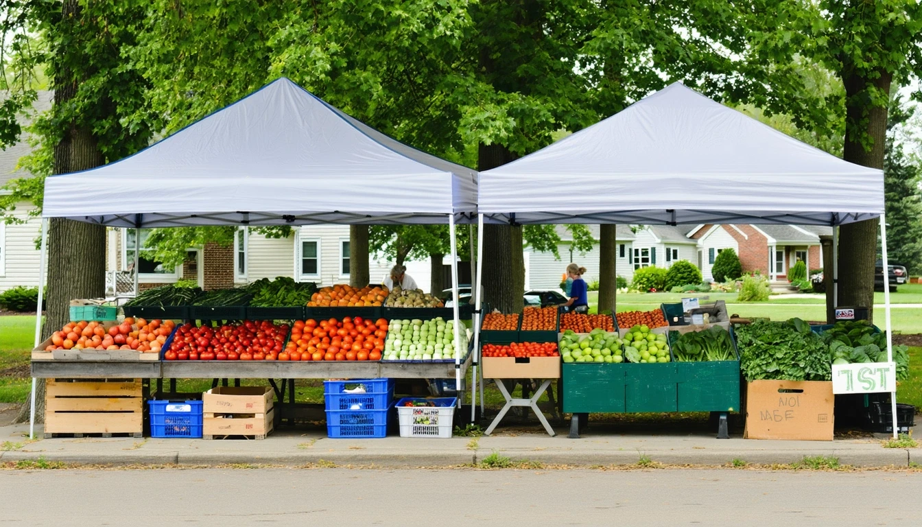 A suburban farmer's market in Warren, Michigan on a sunny morning, with vendors arranging fresh produce under tents.