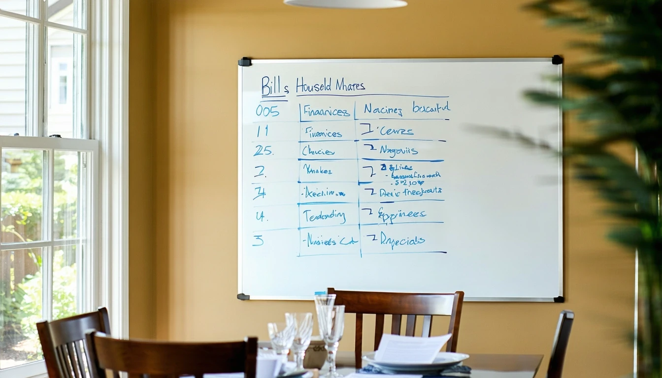 A whiteboard on a dining room wall listing bills and reminders, with a person sitting at the table managing finances in a tidy West Hartford home.