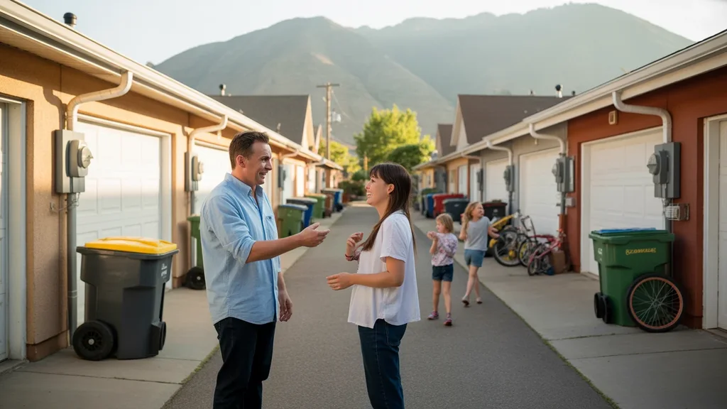 Neighbors talking near electric meters in alley behind suburban homes in West Valley City Utah at sunset