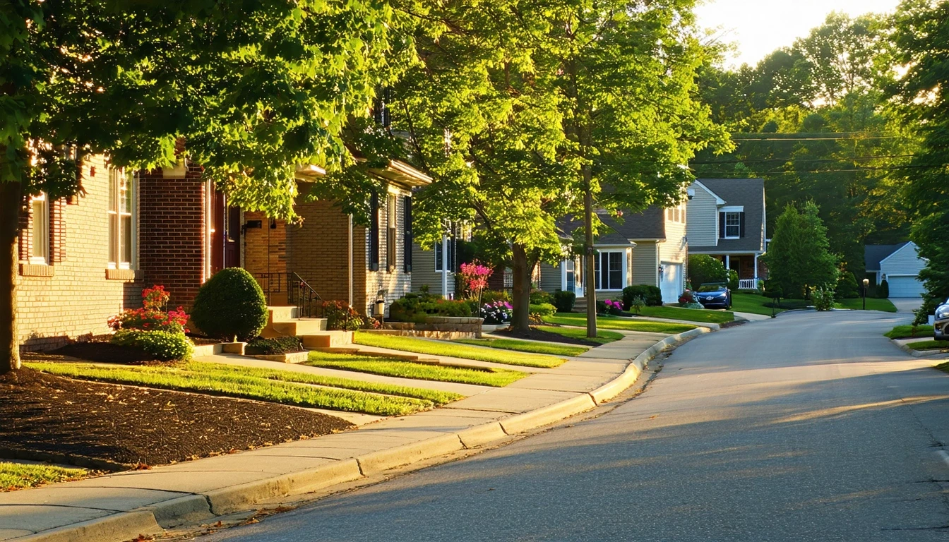 A peaceful suburban street in Wilmington, Delaware with single-family homes, manicured lawns, and golden afternoon light.