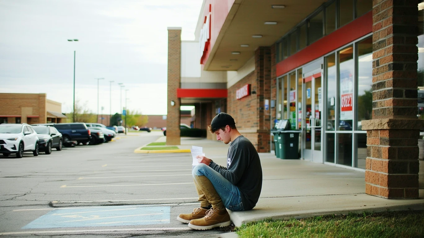 A young person sits on a curb outside a grocery store, looking at their receipt.