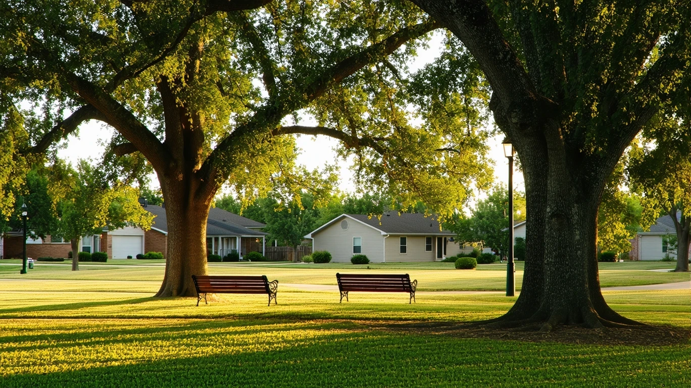 A peaceful park lawn with old oak trees and empty benches, bathed in golden-hour light in a quiet suburban neighborhood.